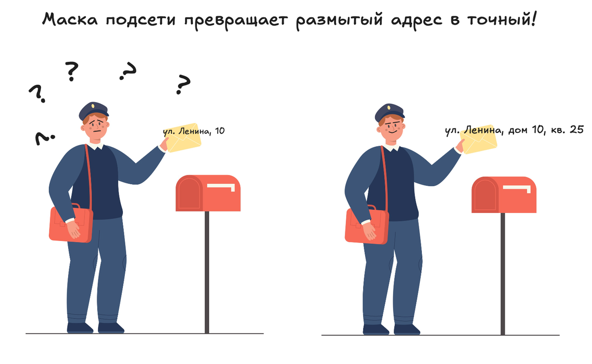 В прошлых уроках мы разобрались, что IP-адрес — это уникальный адрес устройства в сети, подобный почтовому адресу. Но представьте, что вы получили письмо с адресом «ул. Ленина, 10». Как почтальону понять, это частный дом или многоквартирный? Если это многоквартирный дом, то сколько в нем подъездов и квартир? Чтобы устранить эту неопределенность, в реальном адресе мы указываем не только улицу и дом, но и номер квартиры. В мире IP-адресов ту же самую роль уточнения играет маска подсети.