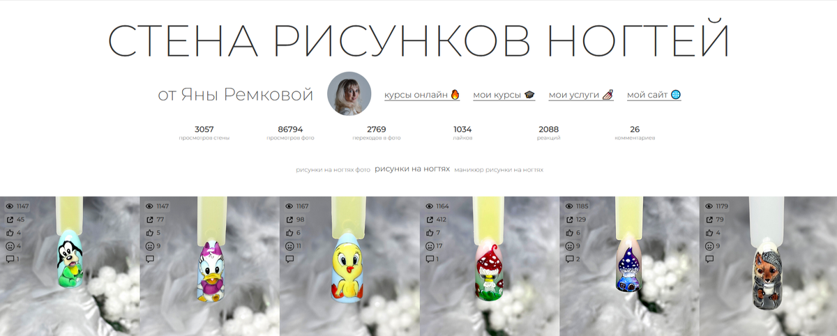 нейл‑арта - стена рисунков ногтей. Это не просто подборка фотографий, а настоящая творческая лаборатория, где оживают самые смелые идеи дизайна ногтей. Здесь вы найдёте работы на любой вкус: от лаконичных минималистичных решений до сложных авторских композиций с детализированной прорисовкой. Каждая фотография — это завершённый образ, в который вложена частичка моей души и профессионального опыта. Я стараюсь регулярно обновлять галерею, чтобы вы всегда могли увидеть свежие работы и вдохновиться новыми