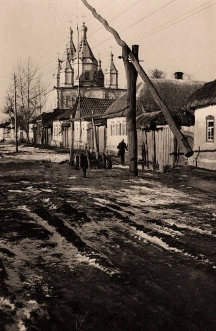 Фотография от 25 марта 1942 года, во время фашистской оккупации, село Замостье, Суджанский район, Курская область. Слобода Замостье (ныне Суджанский район Курской обл. РФ) была основана как форштадт сотенного города Сумского Слободского казачьего полка - Суджи. История Спасо-Преображенского храма сл. Замостье уходит в XVII в. Согласно «Описи новопостроенного города Суджи, учиненной воеводою Герасимом Семеновичем Рагозиным в 1664 г.»: «За рекой Суджею промеж реки Суджи и речки Смердицы, у Московской и Болгородской дороги …. Стоит церковь во имя Преображения Господа Бога и Спаса нашего Иисуса Христа, середь слободы; а в той слободе 182 двора, а в иных дворех еще люди не живут, строены вновь…»
