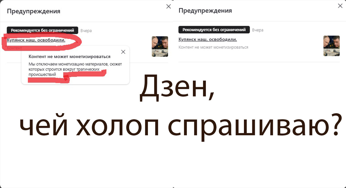 Нет, вы вдумайтесь! Пишешь статью — патриотичную, правдивую, о реальном подвиге наших ребят. О том, как освобождали Купянск. Город возвращали, операцию блестящую проводили — всё как есть. И что же? А вот что. Прилетает от Дзена бумажка с цитатой: «Контент не может монетизироваться. Мы отключаем монетизацию материалов, сюжет которых строится вокруг трагических происшествий». У меня два вопроса, и оба риторических. Первый: вокруг каких, простите, «трагических происшествий» построен сюжет? Я что, писал про гибель людей? Про разрушения? Нет! Я писал про ОСВОБОЖДЕНИЕ. Про то, как наши военные делают свое дело — профессионально, смело, возвращая родную землю. Разве освобождение — это трагедия? Для кого? Для тех, кто там сидел и строил из себя хозяев? Так для них это действительно трагедия, но при чем тут моя статья и наши солдаты? И второй вопрос, главный: ДЗЕН, ты вообще чей? Ты чей, спрашиваю? Ты на чьей территории работаешь? Чьи люди читают твою ленту? Кто тебе дает хлеб и масло, в конце