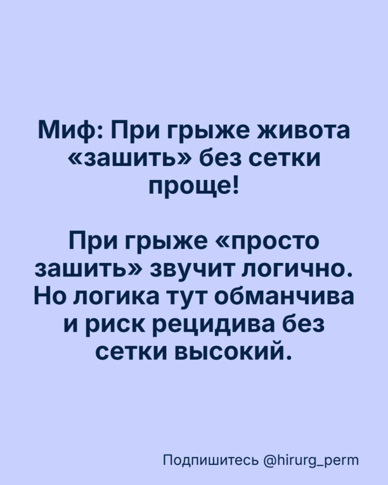 Сразу две группы людей иногда топят за простое ушивание грыжи - старые хирурги со своим "ценным мнением" и пациенты, которые сначала услышали это мнение и решили, что оно верное.