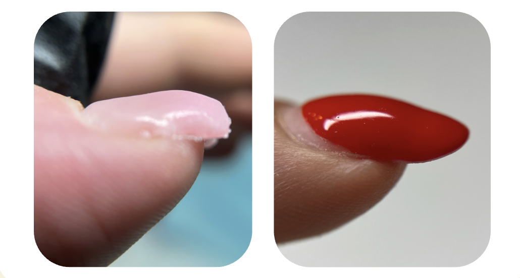 В попытке «выровнять всё за раз» мастера накладывают много базы, особенно плачевно, когда таким образом выравнивают ногти-трамплины. Материал не просыхает внутри, образуются пузыри, и через пару дней — отслойка.