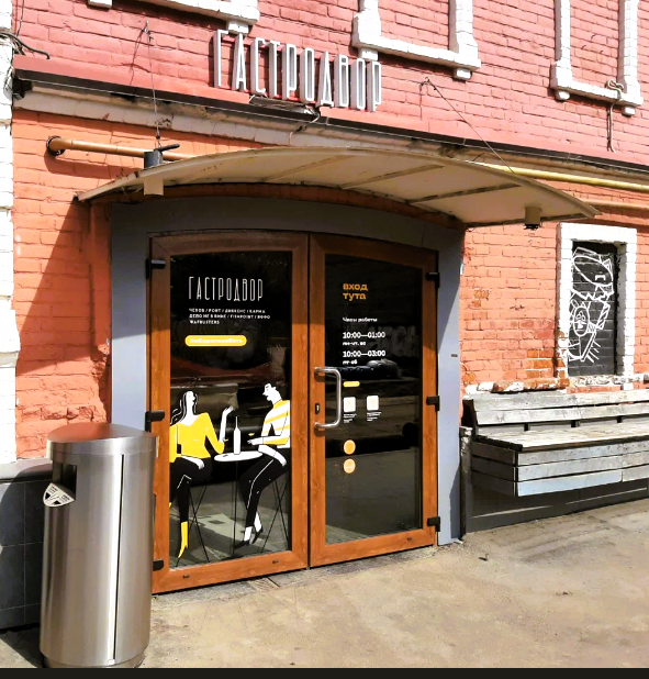 В Саратове на Проспекте Столыпина в доме номер 29 находится интересное место для ценителей разных блюд со всего мира. Это такой фудмолл из 13 ресторанов, объединенных одной концепцией. Тут два уровня со столиками. Можно сидеть снизу на фудкорте, можно сверху на балкончике, можно внутри ресторанов. Тут есть русский, китайский, европейский, вьетнамский, ближневосточный, пивной ресторан и бургер-бар и коктейльный бар. Еще английский, итальянский, грузинский ресторан и другие. Концепция гастродвора заключается в том, что можно сесть на фудкорте, выбрать в приложении по Куар коду нужный ресторан, нужные блюда, вызвать официанта из этого ресторана специальной кнопкой, заказать блюда и тебе принесут к столику. Это можно сделать за одним столиком из нескольких ресторанов, на выбор. Мне кажется, очень удобно. Не надо выбирать ресторан и сидеть только в нем одном, а выбрать столик и к нему заказать, что хочется. Оформление довольно интересное вокруг. Рядом с нами был второй выход, тоже интересн