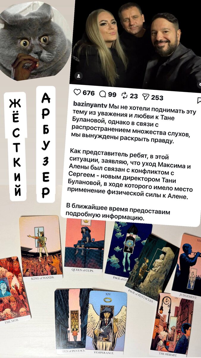 😳Ничего не понятно, но оочень интересно: подтанцовка Булановой через 20 лет все-таки вышла на пенсию из-за абьюза со стороны нового директора (со слов самой подтанцовки). 🐱Что там вообще у них такое творится? По основе ситуации (Умеренность, 10 пентаклей) дело ясно-понятно в бабосиках и условиях работы: видать кормили ребят обещаниями и терпение лопнуло. Причем лопнуло у одного из мужчин (Король жезлов), возник общий конфликт, где женщина (Алена) слишком эмоционально высказывалась (Королева кубков) и возможно, перешла черту. Все участники вели себя, как дети (пажи), много эмоций, мало толку. Типичная потасовка. Рукоприкладство случилось, по аркану паж кубков- небольшое, но впечатлило очень сильно. Директор у Тани эдакий Отшельник, виноватым себя не считает, скорее обиженным. Ну а Таня «горько плачет», — всех их она считает своими друзьями, поэтому кармический аркан Суд показывает высшую степень кабздеца от случившегося: выражение лица мужика на карте слева лучше всяких пояснений (ар