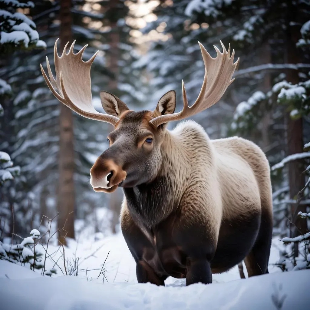 Лоси являются крупнейшими представителями семейства оленевых. Они распространены преимущественно в регионах Северной Америки, Европы и Азии. Эти животные привлекают внимание ю благодаря своим уникальным адаптациям к суровым условиям обитания. У лосей массивное телосложение с высоким ростом в холке до 2 метров и массой тела от 300 до 800 кг у взрослых особей. Самцы значительно крупнее самок и обладают крупными рогами, достигающими массы более 15 кг. Рога имеют лопатовидную форму и ежегодно сбрасываются после окончания брачного периода. Шкура лося покрыта густой шерстью темно-коричневого или черного цвета, что обеспечивает надежную теплоизоляцию в холодных климатических условиях. Копыта длинные и мощные, приспособленные для передвижения по глубокому снегу и болотистой местности. Ареал распространения лосей охватывает леса, болота и тундру, где они предпочитают участки с густым подлеском и водоемами. Основу рациона составляют листья, побеги деревьев и кустарников, а также водная растит