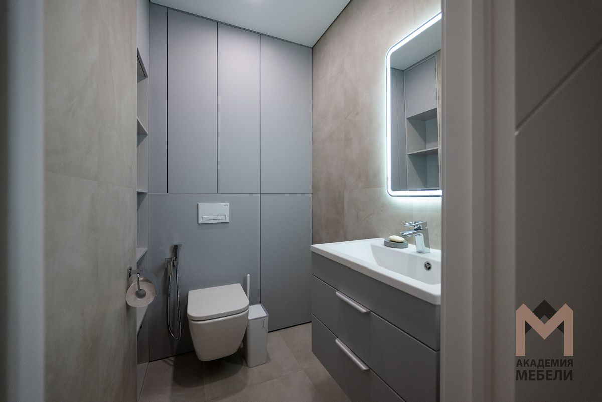 Наша новая работа – мебель в ванную и санузел на пр-кт Ленинградский, 105 Каждой семье в новой квартире особенно важно, чтобы мебель выглядела красиво и аккуратно, а еще чтобы она была удобна в ежедневном использовании. Для проекта на Ленинградском, 105 мы сделали мебель в ванной и туалете, которая помогает поддерживать порядок и единый стиль всего интерьера. Корпус всех элементов — влагостойкая плита Ламарти в оттенке "Серый влагостокий", фасады — МДФ в приятном матовом оттенке «Серый софт». Это прочные и лёгкие в уходе материалы, которые не боятся воды, прочны и кажутся «тёплыми» даже на ощупь. В санузле продумано всё до мелочей. Подвесная тумба с двумя выдвижными ящиками не занимает место на полу — удобно убирать, ничего не мешает проходу. Встроенный шкаф до потолка вмещает бытовую химию, запасы бумаги и любые мелочи, которые обычно стремятся занять видимые поверхности. Доступ к коммуникациям организован быстро и просто: ничего не нужно разбирать, достаточно открыть нужную секцию.