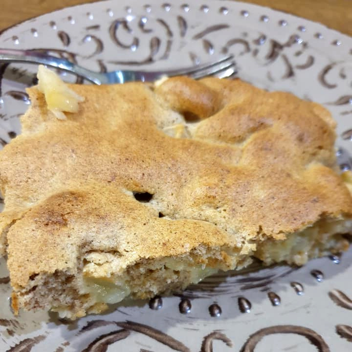 ✔ Яблоки «Антоновка» - 3 средних, очищенных от сердцевины; ✔ Яйца - 2 шт. (желтки и белки разделены); ✔ Сахарозаменитель (сорбит) - 70 г (примерный эквивалент 70 г сахара по объему и 35 г сахара по сладости); ✔ Мука полбяная - 80 г; ✔ Масло растительное - 30 г; ✔ Пахта (или нежирный кефир - 50 г (примерно 3 ст.л., для корректировки консистенции); ✔ Корица - 1 ч. л.; ✔ Разрыхлитель - 5 г (1 ч.л.). Тесто сперва задумала просто как бисквит. Желтки растерла с сорбитом, белки взбила отдельно. Аккуратно смешала, добавив муку из полбы, растительное масло, корицу, разрыхлитель. Получилось слишком крутое тесто, добавила немного пахты. В результате тесто по консистенции получилось как нежидкая сметана. Три нарезанных антоновки выложила в неглубокую форму, залила тестом. Выпекала 20 минут в разогретой до 190 градусов духовке. По виду очень хорошо, да и вкусно, но не сладкая абсолютно. Это потому, что сорбит примерно в 2 раза менее сладкий, чем обычный сахар. Если хочется более сладкой шарлотки