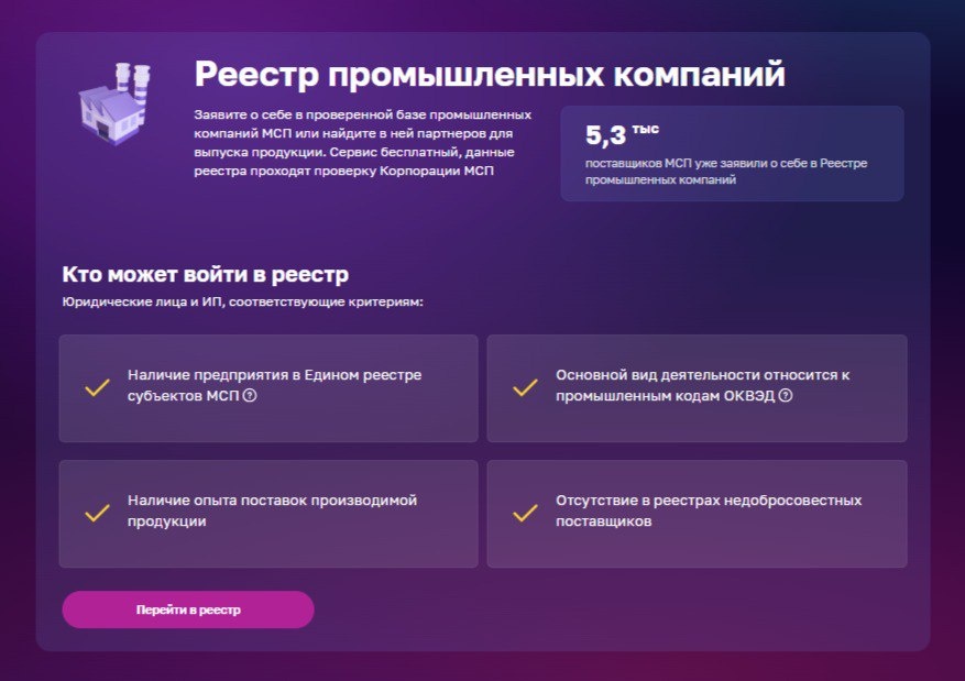 Хотите, чтобы о Вашей компании узнали партнеры в России? Или ищете надежных поставщиков? ✅ Ознакомьтесь с Реестром промышленных компаний на серсиве МСП.РФ Уже 5,3 тысячи субъектов малого и среднего бизнеса нашли новых клиентов и партнеров. Присоединиться могут юридические лица, если: ▪️компания состоит в Едином реестре МСП ▪️основной ОКВЭД – промышленный ▪️есть опыт поставок ▪️компания не находится в списке недобросовестных поставщиков 🌐 Платформа МСП.РФ – это государственная поддержка для предпринимателей и самозанятых. 👰♂️ Реализуется в рамках национального проекта «Эффективная и конкурентная экономика»