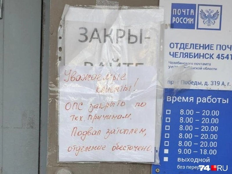 На Северо-Западе из-за потопа закрыли здание с почтой и ПВЗ Wildberries Заказы и посылки клиенты не могут забрать с конца октября в здании на проспекте Победы, 319а. Челябинка Карина ждала отпариватель по почте, но забрать его не получилось. На двери она увидела листочек, на котором написано, что подвал затопило, здание обесточено, поэтому отделение не работает. Сейчас листовки уже нет. «В результате в отделении застряли посылки. Я попыталась связаться с горячей линией, но, оператор предложил только платные варианты доставки и переадресации, которые меня не устраивают», — говорит Карина. Девушка связывается со службой поддержки около недели и не хочет ежедневно ходить к почте, чтобы узнать, открылось ли здание. Место пользуется спросом, у некоторых людей поджимают сроки хранения посылок, кто-то идет в другие отделения, чтобы что-то отправить. 🟥 Ответ «Почты России». В компании подтвердили, что авария на водоводе случилась 29 октября: пострадал только подвал, вышел из строя электро