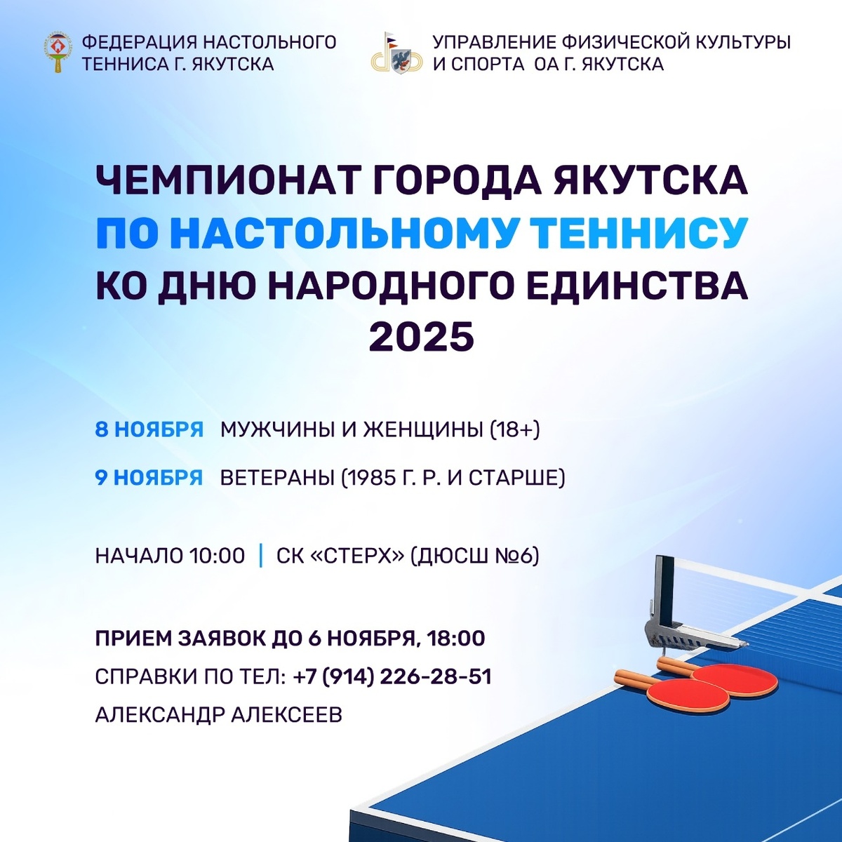 Отчет ГСК Чемпионата города Якутска по настольному теннису Соревнования проходили в спортивном зале Спортивного комплекса "Стерх", на 8 столах. Всего участвовало среди мужчин и женщин 33 спортсмена, среди ветеранов 74 участника. Отчет о личных соревнованиях среди мужчин и женщин Мужчины 1 м. Тимофеев Владислав 2 м. Алексеев Михаил 3 м. Слепцов Артур 3 м. Вензель Евгений Женщины 1 м. Беленкова Анастасия 2 м. Шпнева Надежда 3 м. Другина Евдокия 4 м. Сыромятникова Сардана Парный разряд: Мужчины 1 м. Барашков Аян/Потапов Сергей 2 м. Вензель Евгений/Данилов Вячеслав 3 м. Алексеев Михаил/Павлов Степан 3 м. Аммосов Ариан/Аксенов Михаил Женщины 1 м. Беленкова Анастасия/Константинова Марианна 2 м. Другина Евдокия/Аржакова Матрена 3 м. Шпнева Надежда/Сыромятникова Сардана Смешанный парный разряд: 1 м. Барашков Аян/Другина Евдокия 2 м. Васильев Александр/Константинова Марианна 3 м. Платонов Михаил/Сыромятникова Сардана 3 м. Данилов Вячеслав/Аржакова Матрена Отчет о личных соревнованиях сре