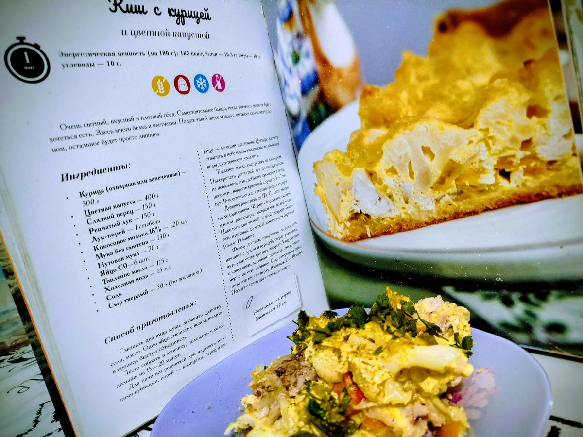 Всем приветы! Наконец сошлись все звёзды , и в моём доме в одно время оказались курица, хотя и немного, цветная капуста, болгарский перец. Итак, готовим киш с курицей и овощами из "Осознанной кулинарии" Д. Савельевой и Д. Третьяковой. Что такое вообще киш? Алиса 👩🍳 "Киш (quiche) — блюдо французской кухни, открытый пирог (тарт) с основой из рубленого песочного теста (pâte brisée). Ключевые особенности: Заливка: смесь яиц и сливок (так называемый appareil à quiche или «английский крем» — crème anglaise). Начинка: традиционно включает копчёную грудинку (лардон) — это характерно для классического варианта, киш лорен (quiche lorraine). Однако существуют многочисленные вариации с другими ингредиентами: луком, грибами, шпинатом, лососем, тунцом, овощами и т. д. Тесто: рубленое, без сахара — плотное и хрустящее. Происхождение: Название происходит от немецкого Kuchen («пирог», «торт»). Блюдо появилось в Лотарингии (регион на северо‑востоке Франции, исторически связанный с Германией).