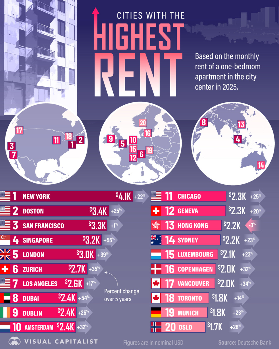 Гонконг сохраняет лидерство в рейтинге самых дорогих для аренды городов мира, где стоимость аренды двухкомнатной квартиры достигает $4679 в месяц. Аналитический центр Visual Capitalistпредставил прогноз на ближайшие годы, выделив 20 городов с наиболее высокими арендными ставками. В топ-5 вошли Нью-Йорк ($3945), Шэньчжэнь ($3511), Сингапур ($3500) и Лос-Анджелес ($3399). Ключевые тренды рынка Рейтинг демонстрирует несколько устойчивых тенденций. По данным SOTHEBY'S International Realty, наиболее значимой стало усиление позиций азиатского региона, где представлено 55% городов из топ-20. «Мы наблюдаем смещение фокуса инвесторов в сторону азиатских мегаполисов, где сочетание динамичного экономического роста и развитой инфраструктуры создает идеальные условия для долгосрочных вложений», — отмечает Мария Котова, управляющий партнёр CIS SOTHEBY’S International Realty. Отмечается растущая привлекательность Ближнего Востока: Дубай поднялся на 13-е место ($2728), а Абу-Даби вошел в ТОП-20 ($236