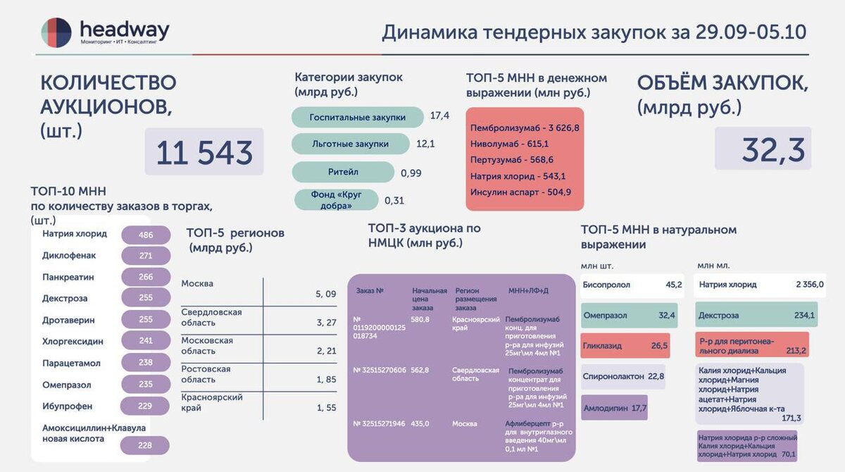 Мы подготовили для вас краткую инфографику по динамике тендерных закупок за период 29.09 – 05.10: ✅количество проведённых аукционов; ✅объём закупок в денежном выражении; ✅топ-3 аукциона по НМЦК; ✅ТОП-5 регионов по объёму закупок; ✅самые востребованные МНН по количеству заказов; ✅распределение закупок по категориям (госпитальные, льготные и др.); ✅топ-5 МНН в натуральном и денежном выражении. Подписывайтесь на наш ТГ-канал!
