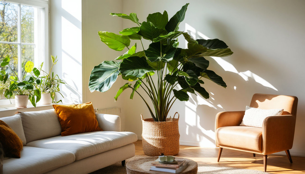 Крупные комнатные растения решают эту проблему элегантно. Один куст высотой полтора метра с эффектными листьями заменяет целую коллекцию мелочи. Взгляд цепляется за акцент. Комната обретает структуру. Пространство дышит.