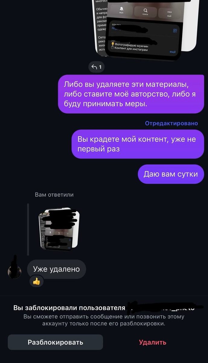 Про воровство контента. Есть персонажи, которые грубо воруют авторский контент из моего канала. Если вы думаете, что я ничего не вижу - вы заблуждаетесь. 🤭 Сегодня помощница нашла одного такого товарища, взрослый мужчина, мужской фотограф из другого города. Я написала ему с просьбой удаления моих статей из его канала, которые были просто copy-past (с сохранением даже регистра акцентных слов и эмодзи). Важно помнить, что за нарушение авторских прав предусмотрены штрафы, и есть отдельное большое направление права в этой области. Многие думают, что такие вещи остаются незамеченными, и «один раз не пи**рас водолаз». Просто люди у нас не особо привыкли защищать свои права в области контента. Очень зря. Главное, что после удаления украденного контента, факт нарушения прав остаётся. И остается так же право обратиться в суд за штрафом) Поэтому дорогие мои копипиздеры, будьте аккуратны. Списывайте хотя бы не слово в слово. P.S. в суд на этого товарища обращаться не буду - первый выстрел