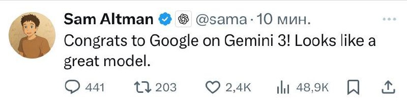 Весь интернет в восторге от Gemini 3, даже Сэм Альтман. Впервые пишет про конкурентов такое.