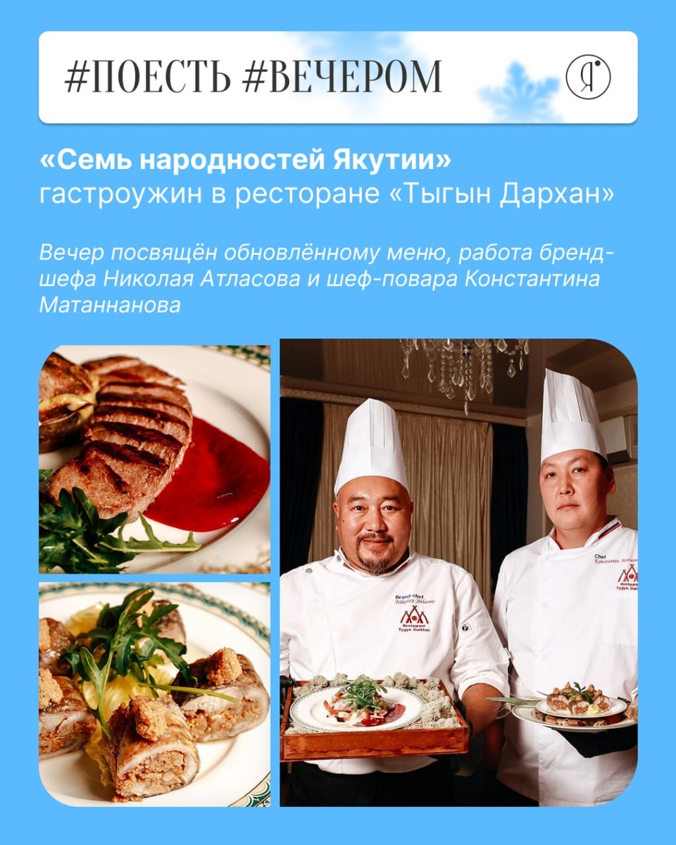 Гастроужин «Семь народностей Якутии» #Поесть #Вечером Каждое блюдо отражает культуру одного из коренных народов Якутии. Каждое блюдо становится частью большого повествования, раскрывающего жизнь, обычаи и быт коренных народов Якутии: якутов, русских, эвенов, эвенков, чукчей, юкагиров и долганов. Меню отражает глубокий симбиоз разных этногрупп, живущих бок о бок многие века. Авторское меню демонстрирует богатство вкусовых сочетаний и удивительную гармонию вкусов, характерных именно для северного края. 1 Подача — Народ САХА (Якуты) Блюдо: Саламаат 2 Подача — ЭВЕНЫ и ЧУКЧИ Блюдо: Гондынча олда и кит-кит (из чира и мяса оленины с брусничным, морошковым и острым соусом) 3 Подача — ДОЛГАНЫ Блюдо: Сугудай из трёх видов рыбы 4 Подача — ЭВЕНКИ Блюдо: Салат Иенгра (с олениной, опятами и кедровыми орехами) 5 Подача — РУССКИЕ СТАРОЖИЛЫ Блюдо: Борщ по-старорусски 6 Подача — ЮКАГИРЫ Блюдо: Кулибаха по-юкагирски (чир в сливочном соусе с голубикой и манной крупой) 7 Подача — ДЕСЕРТ по-олекм