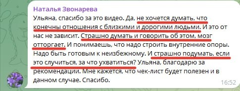 Наталья очень точно описала то, что чувствует большинство людей, а видео, о котором она пишет здесь. Страшно думать, что что-то может закончиться. Отношения, жизнь, близкие люди могут умереть. Партнёр может передумать, отвергнуть, изменить и уйти. ___________________________ Мозг отталкивает эти мысли потому, что он пытается защитить тебя от эмоциональной боли утраты. Если ты идёшь на поводу этой защиты, избегаешь об этом думать и говорить, это фиксирует твой страх и создаёт хроническую тревогу с "А вдруг...?" Однажды это всё равно случится. Никто не избежит потерь и кризисов. Никому не дали таких гарантий на входе. Никакая тревога от этого не спасёт. _______________________ Страх - не враг. Он говорит о том, что тебе есть что терять, что ты любишь, что тебе дорого. Боль - не враг. Она говорит о том, что ты потерял то, что любил и то, что тебе дорого. Ты не можешь всё время жить с мыслью о потере. Подготовиться к утратам полностью, невозможно, но ты можешь укреплять себя. _____________