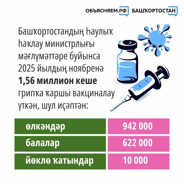Башҡортостанда грипҡа ҡаршы прививка яһау ябай һәм уңайлы! 2025 йылдың ноябренә 1,56 миллион кеше, шул иҫәптән: · 942 000 өлкән кеше · 622 000 бала · 10 000 йөклө ҡатын вакциналау үткән. Ҡайҙа һәм нисек прививка яһатырға? Грипҡа ҡаршы вакцинаны теркәлгән йәки беркетелгән урында эшләтергә мөмкин. Кәрәкле документтар: паспорт, СНИЛС, прививка сертификаты (булһа). Яҙылыу ысулдары Дәүләт хеҙмәттәре порталы аша, 122 телефоны буйынса йәки участка терапевтында. Кемгә прививка яһау айырыуса мөһим? · мәктәп уҡыусыларына · 60 йәштән өлкәндәргә · ваҡытлыса медицина сикләүе тамамланғандарға (киләһе 2 аҙнала тәҡдим ителә) · эшләүсе өлкәндәргә Үҙегеҙҙе һаҡлағыҙ, һаулығығыҙҙы хәстәрләүҙе оҙаҡҡа һуҙмағыҙ! Источник https://uchaly102.ru/?p=111676