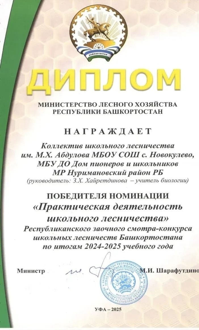 Учащиеся Новокулевской школы стали победителями Республиканского смотра‑конкурса школьных лесничеств Башкортостана в номинации «Практическая деятельность школьных лесничеств». Это заслуженная награда за труд, вовлечённость и любовь к природе. Гордимся достижениями и желаем новых свершений! Отдельная благодарность руководителю — Хайретдиновой Залифе Ханифовне за профессионализм, терпение и вдохновение, которые помогают ребятам расти и побеждать. Поздравляем школьное лесничество имени Абдулова М.Х. с победой.