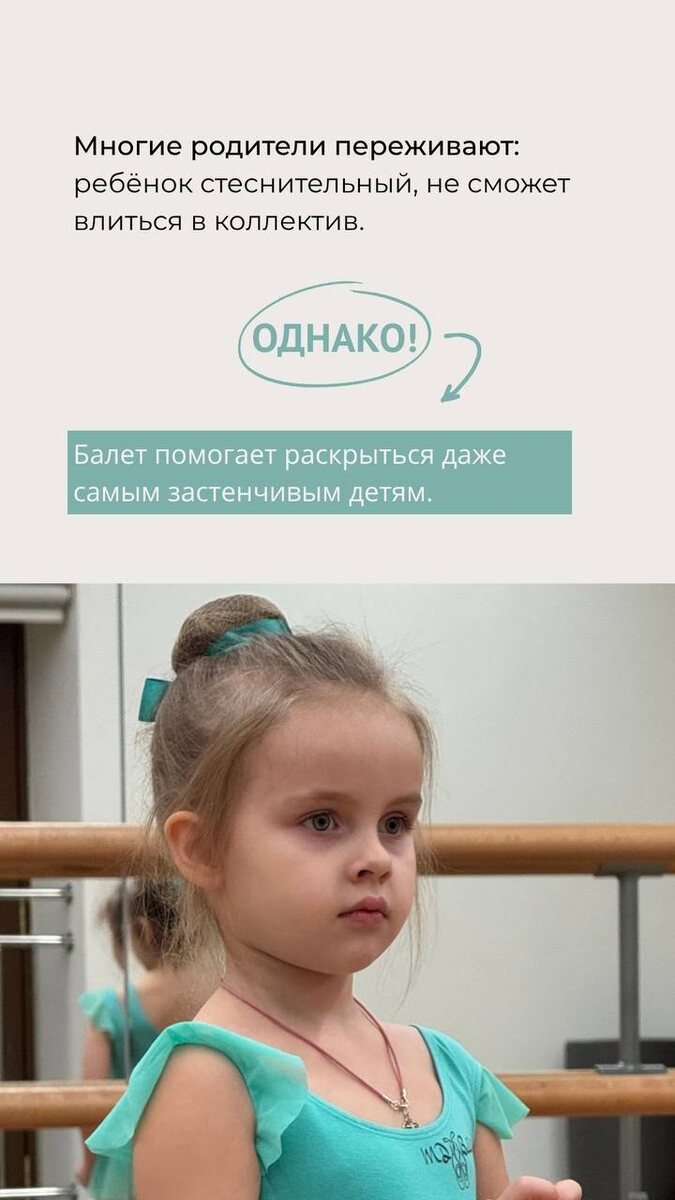 ❤️ Многие родители переживают: ребёнок стеснительный, не сможет влиться в коллектив. ОДНАКО! 🩰Балет помогает раскрыться даже самым застенчивым детям. Каждое движение — шаг к свободе и радости. На занятиях наши ученики учатся не просто танцевать - они развивают внимание, координацию и уверенность. ☝️Без давления, с поддержкой педагога и друзей. Балет помогает раскрепоститься, почувствовать уверенность и радость от движения. Со временем даже самые тихие дети раскрываются. Главное — дать им пространство, где МОЖНО БЫТЬ СОБОЙ. И здесь самые главные ваши помощники: ✔️ педагог (который направит на верный путь); ✔️ зеркало (в котором ребенок видит свой прогресс); ✔️ музыка. Мы создаем комфортную атмосферу - где каждый ребёнок чувствует себя на своем месте ❤️