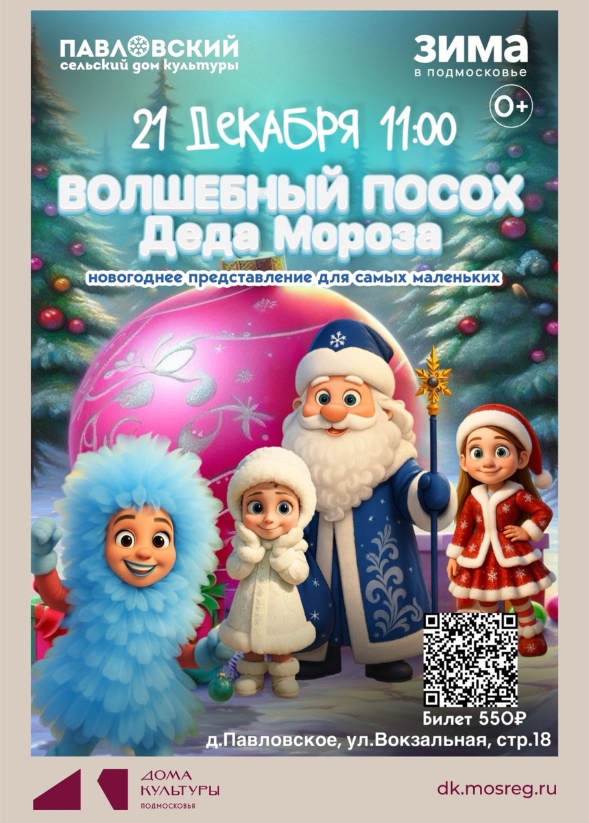 ✨ «Волшебный посох Деда Мороза» — увлекательная детская новогодняя программа, полная чудес и веселья! Дед Мороз вместе с помощниками вовсю готовится к праздникам: проверяет список желаний, упаковывает подарки и настраивается на весёлые поздравления. Но перед самым выходом случается беда — он теряет свой волшебный посох! В ходе программы их ждут: ✔️зажигательные новогодние танцы; ✔️весёлые игры и конкурсы; ✔️увлекательные поиски волшебного посоха. 🚫 Возраст: 0+ 📆 21.12.2025🕒11:00 🏢 Павловский сельский дом культуры (СДК) 📍 г.о.Домодедово, дер.Павловское, ул.Вокзальная, д.18 💰 Цена: 550 ₽ 🎫 Купить билет: https://iframeab-pre5158.intickets.ru/event/68243991/ ✅ Мероприятия Домодедово https://dzen.ru/id/66f10385cc4c5a16f7b5fb02 http://vk.com/domodedovo_events http://dzen.ru/domodedovo_events