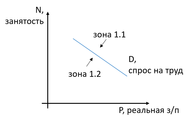 В зоне 1.1 стоимость произведённого работниками предельного продукта ниже их з/п. Это значит, фирмам невыгодно держать некоторых работников (раз они производят меньше, чем платит им фирма), что приводит к снижению зарплаты и/или занятости, в общем, смещению влево вниз, по направлению к кривой. Если же з/п ниже предельного продукта (зона 1.2), то это значит, что фирмы, конкурируя между собой (если у нас есть справедливая конкуренция), будут повышать зарплаты и/или нанимать дополнительных рабочих, в общем, смещать текущую ситуацию вправо вверх, по направлению к кривой.