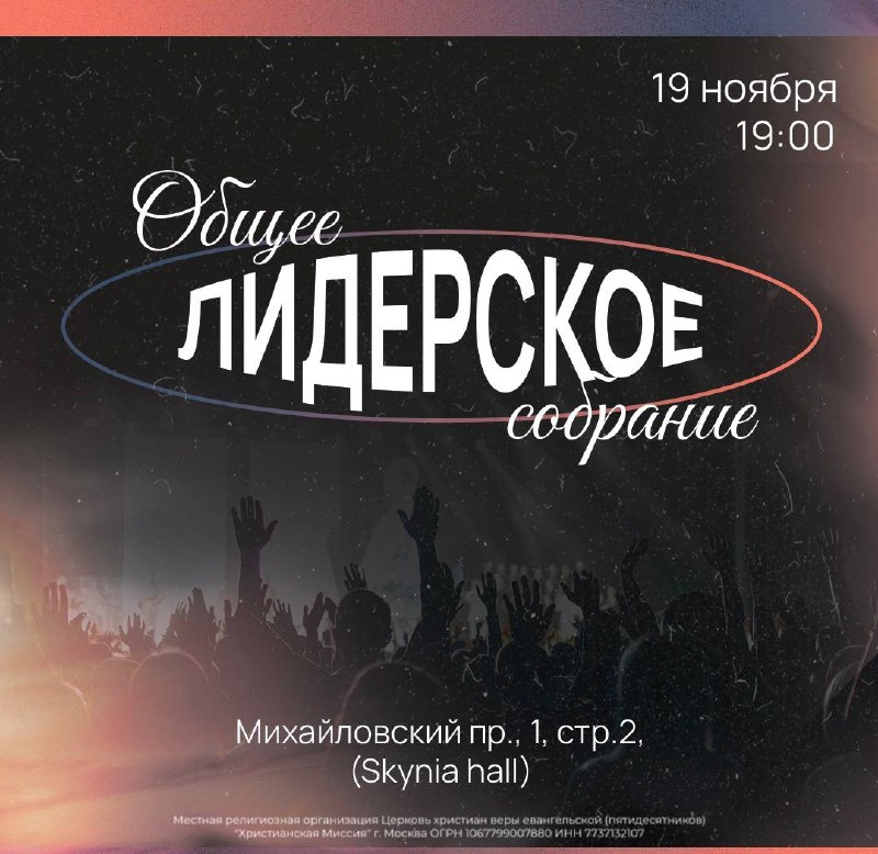 Братья и сестры, ждем сегодня вас на общее лидерское собрание! 19 ноября / 19:00 / Михайловский пр., 1, стр. 2, (Skynia hall) 🤨 ОБРАТИТЕ ВНИМАНИЕ, ЧТО АДРЕС ИЗМЕНИЛСЯ 🤨 На этой встрече ждём: – лидеров домашних групп; – помощников лидеров домашних групп; – служителей церкви (кто несёт служение в церкви). До встречи! 🤓
