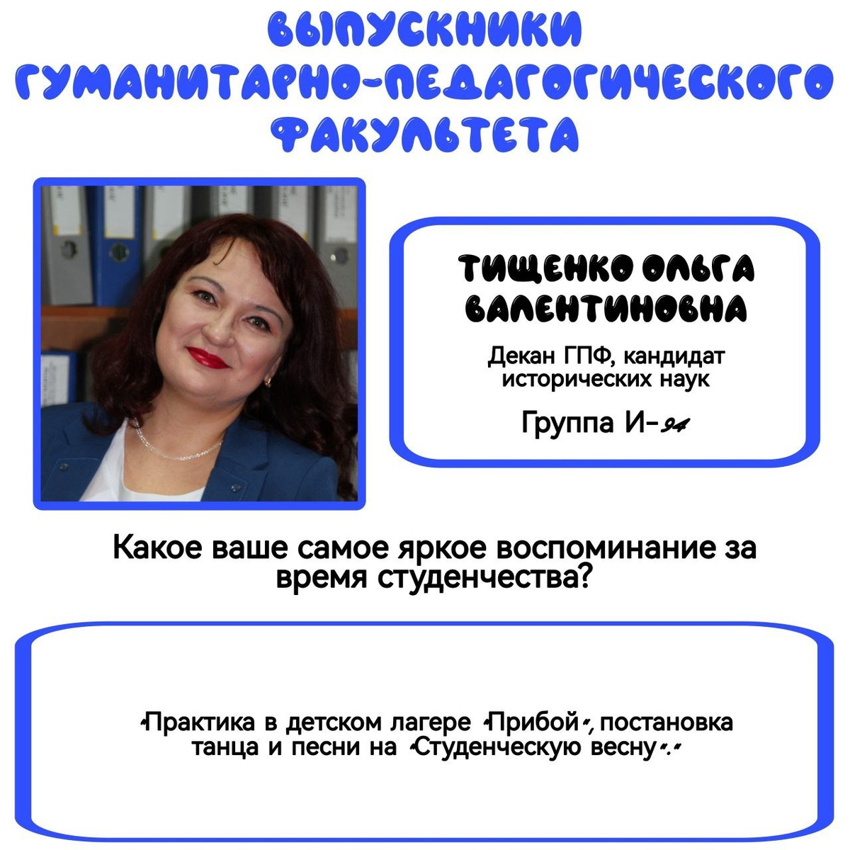 Уважаемые преподаватели, поздравляем вас с профессиональным праздником!🥳 Ваша работа крайне важна: вы не только передаёте знания и навыки, но и формируете мышление, воспитываете ответственность и вдохновляете студентов открывать новые горизонты и становиться профессионалами! Гуманитарно-педагогический факультет подготовил интервью с преподавателями-выпускниками, которые поделились своими интересными фактами и советами из студенческой жизни 👆