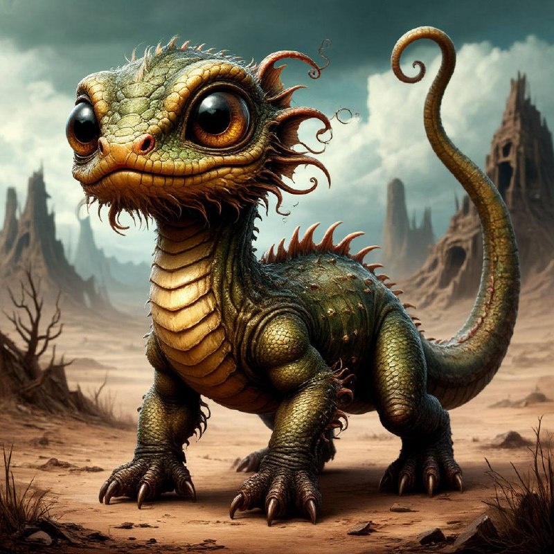 Create a pretty sweet six-tentacled two-legged beast with a snake-like head, huge eyes staring at you, a short neck, a hairy body, a humped back, a long tail and long arms with sharp hooks. The creature survived after apocalypse