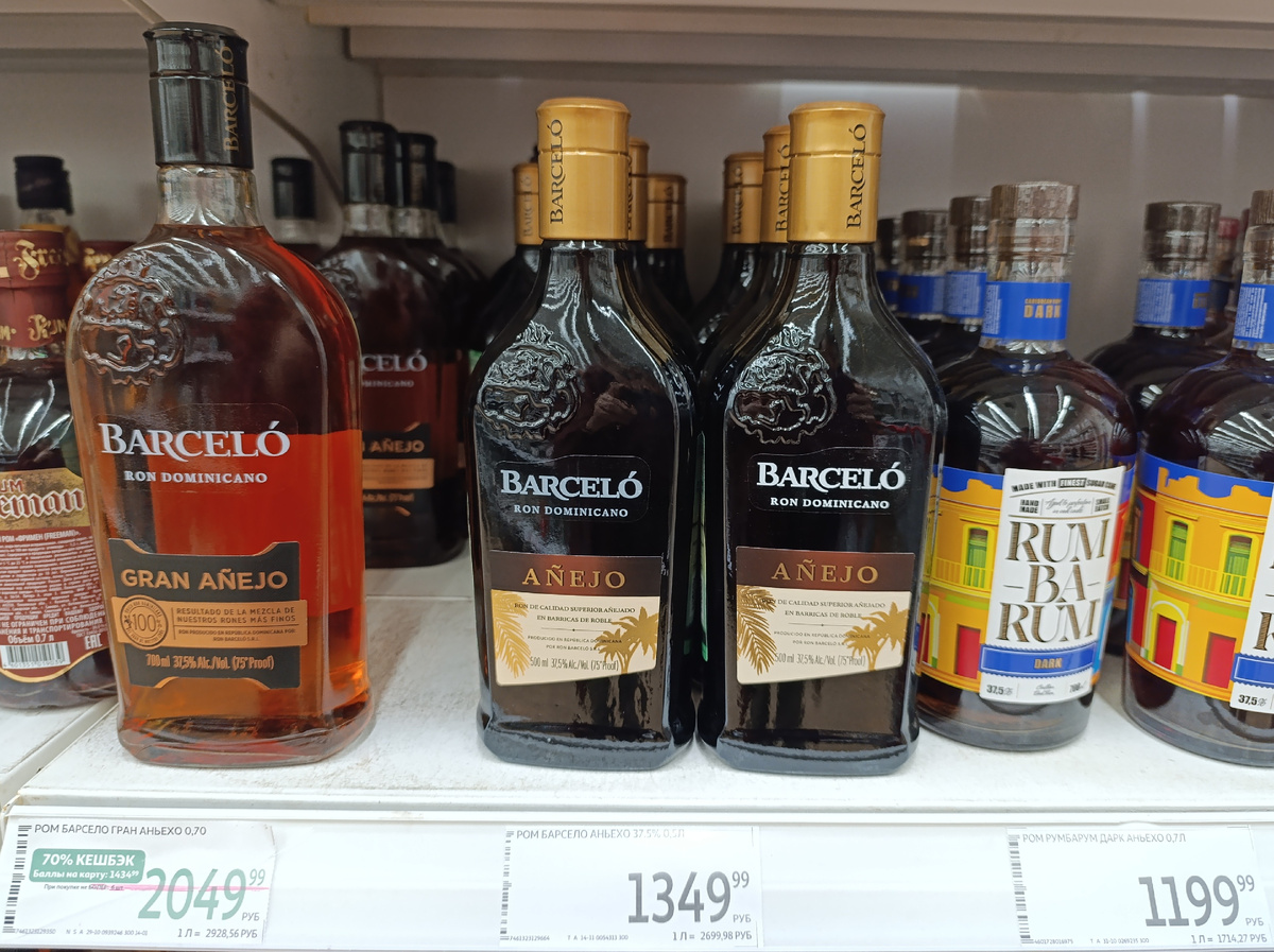 На этот вопрос нет однозначного ответа. Особенно если принять во внимание такую штуку как кешбэк. Например, в "Ашане" на ром Barcelo Gran Anejo (Доминикана) номинальная цена 2 049 руб. Она завышена по сравнению с другими сетями. Понятно, что специально для этой акции с кешбэком 70%! После зачисления кешбэка на карту, о, чудо, цена вдвое ниже, чем где бы то ни было! Всего 615 рублей за 0,7 литра! Вот этот ром на полке "Ашана" первый слева: