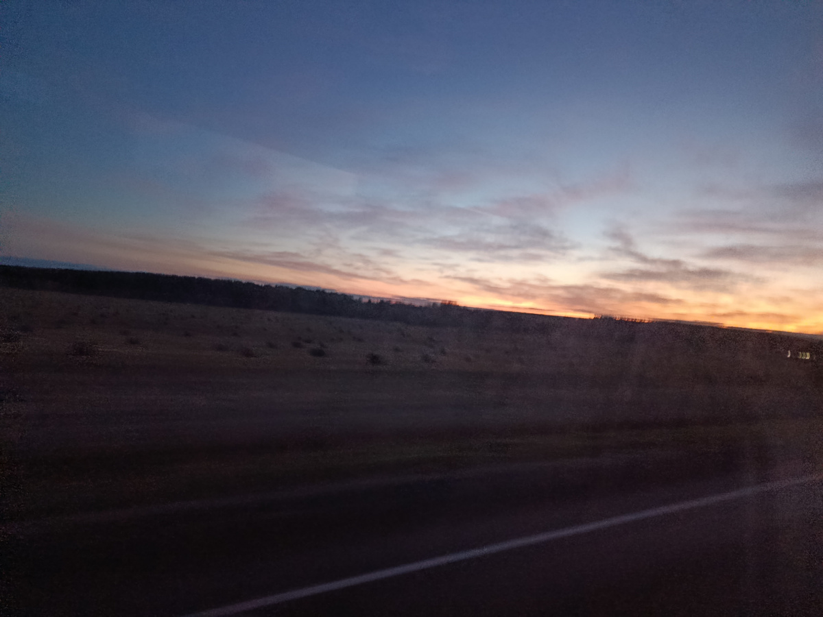 Плохо спалось сегодня. Между мной и мужем влезла наша кошка, по имени Кошка. Она придавила собой одеяло, не давая повернуться и совершенно не реагировала на меня. Конечно, надо было её просто скинуть с кровати, но в полусне лень было. И чего она приперлась? Дома и отопление работает, и печь протоплена. Так нет, надо к нам увлечься! Кур сегодня пришлось по темноте кормить. Я бегом на улицу-там подморозило и звезды! Тишь... А сейчас уже в автобусе еду. За окошком потихоньку светает. Красота!