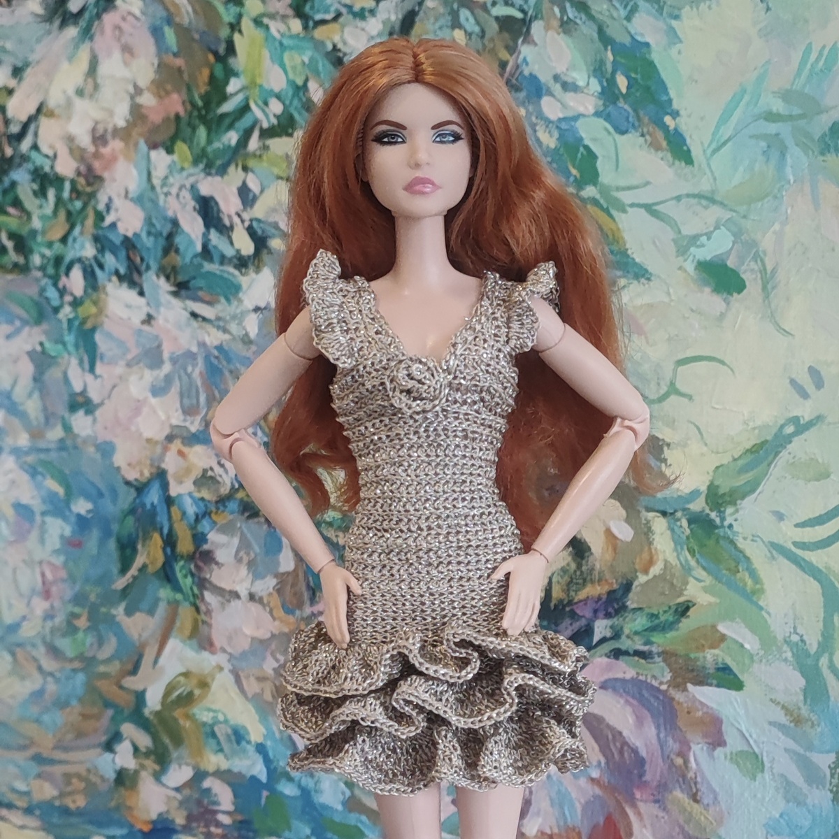 Платье связано из метализированной пряжи. Но за окном дождь, пасмурно, света совсем нет и никакого блестящего эффекта не видно) Мы все еще в санатории, никаких застежек и кнопок у меня с собой нет. Вместо застежки - платиковый маркер для петелек) Возможности позирования ограничены, но очень хочется показать обновку. Ну вот примерили, сфоткались и можно отложить до Нового года) Готовимся потихоньку. Не в тему, но расскажу. Вчера я дошла до местной библиотеки и взяла рассказы Джека Лондона. Перед сном мы с мужем по очереди читали их друг другу вслух. Это было так романтично! Прекрасных занятий всем!