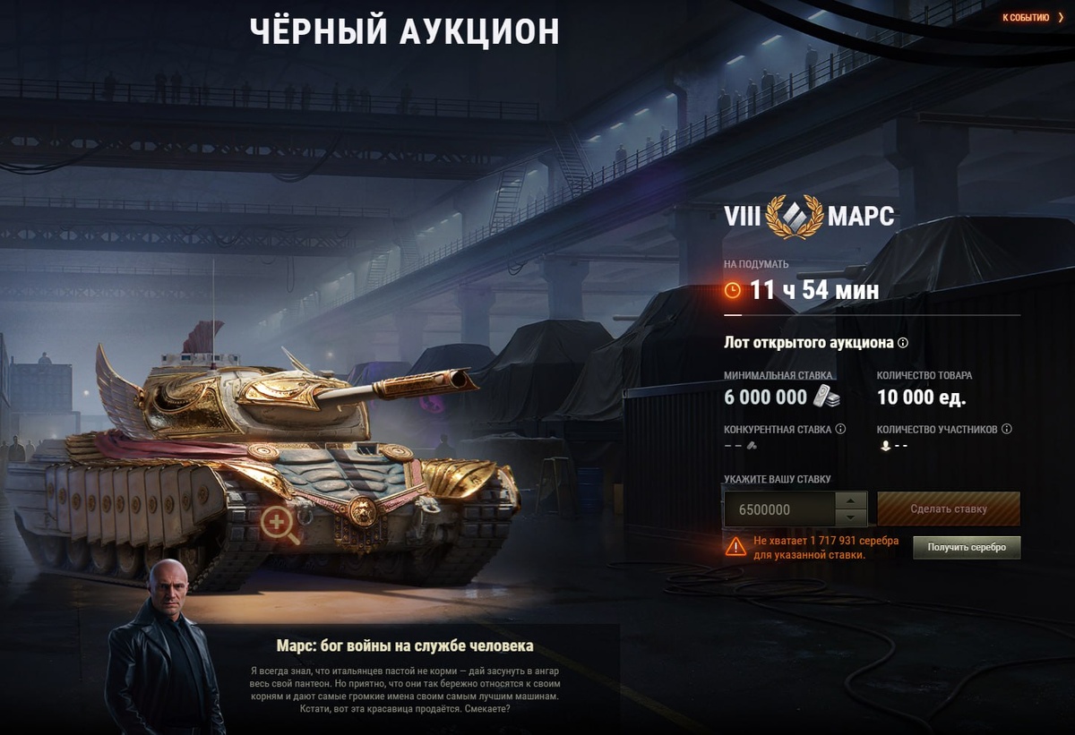 На аукцион разработчик выставил прогретто 46 с неснимаемым стилем (некоторая часть аудитории, показывая на гребень, говорит о его "петушинности", но, как говорится, "кто о чём, а вшивый о бане") Минимальная ПРОШЕДШАЯ ставка была в районе 28 000 000 серебра Достаточно неплохой прем, но всё-таки переоценённый Орудие - 90 мм ковырялка, имеющая дозарядку с 23 сек полного заряжания (9.5/7.1/6.4) и альфой в 240, 2 секунды между выстрелами (720 урона за 4 секунды), с весьма дефолтным пробитием в 212(193)/259(228). Неплохая стабилизация и быстрое сведение в 1.9 сек в комплекте с дозарядкой неплохо компенсируют столь низкий урон с выстрела, настреливать в разы проще, чем на амх сдс Броня - отсутствующая. Зато есть 1400 хп, которые под закалкой превращаются в 1540 Скорость - 55/20 км/ч. Динамика слабовата, но максималку кое-как набрать позволяет Обзор и маскировка - 390 метров обзора в стоке, в сборке без вентилятора будет 435, с ним - 450. Маскировка слабовата (30/22% в полной сборке), но это и