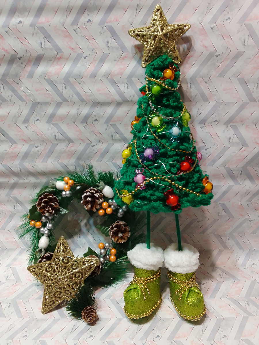 Здравствуйте☺️ . Сегодня я подготовила для вас подробное МК ёлочки 🎄🎄🎄 Давайте свяжем её вместе , ведь новый год уже не за горами . Ну , давайте приступим . Зелёная часть ёлочки Наберите цепочку 350 ВП из пряжа зелёного цвета и вяжем по схеме. У меня получилась полоса длинной 140 см . Ножки- сапожки Нам понадобятся два шарика из пенопласта . Из картона вырезаем две полоски длиной 12 см и шириной 4 см . Склейте трубочки с помощью термоклея . Из картона и фоамирана вырезаем подошву длинной 6 см и склеиваем их вместе . Склейте все детали вместе. Из фоамирана вырезаем две полоски . Длина 12 см, ширина 5 см . Приклеиваем вокруг нашей заявки . Утяжеляет сапожки, так как иначе ёлочка не будет стоять ровно ( подойдут стеклянные шарики, бусины, залейте всё термоклеем ). Пока клей не застыл вставьте две шпажки. Середину фоамирана приклеиваем к шарику из пенопласта . Края фоамирана приклеиваем вместе как на фото . Пряжу зелёного цвета закрутите вокруг шпажек . Полоски