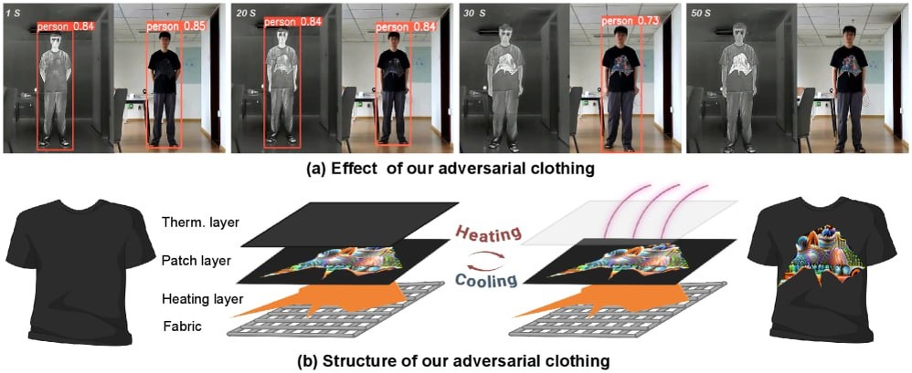 🖤👕 Одежда-невидимка: как обычная чёрная футболка обманывает камеры ИИ Учёные представили изделие, которое выглядит как обычная чёрная футболка, но работает как маленькая система защиты от всевидящего ИИ. Внешне она ничем не отличается от базовой одежды, пока не включается скрытый механизм: в ткань вшиты нагревательные элементы, а поверхность окрашена термохромными красителями, которые меняют рисунок при нагреве. В обычном состоянии это просто чёрная футболка. Но когда владелец даёт команду на активацию, на поверхности “прорастает” скрытый узор — ровно тот самый adversarial-паттерн, который сбивает систему компьютерного зрения с толку. Камеры перестают понимать, где человек, где контуры тела, где лицо. Алгоритмы путаются не только в видимом диапазоне: узор работает и в инфракрасном, то есть даже ночные камеры теряют цель. Вся магия происходит быстро — рисунок проявляется примерно за пятьдесят секунд, как будто ткань оживает. И что особенно поражает: футболка не выглядит как гаджет и