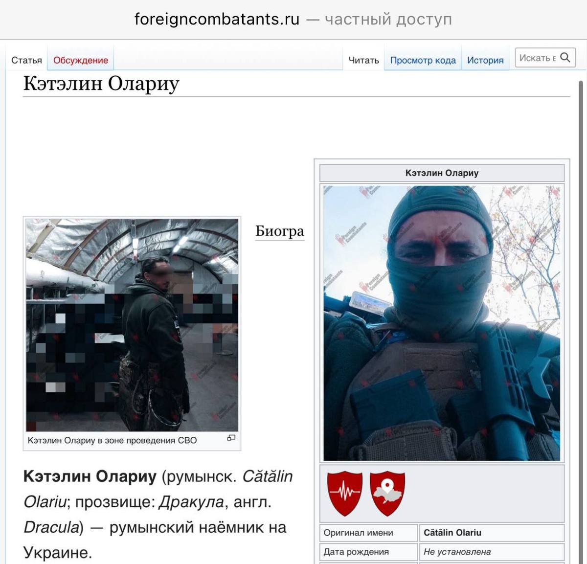 #наемники 🇷🇴🇺🇦«Дракула» из румынского. подразделения наёмников Гетика Кэтэлин Олариу (румынск. Cătălin Olariu) посчитал забавным взять себе прозвище румынского маньяка. На Украину наёмник приехал не позднее сентября 2023 и вступил в Международный легион ГУР. В ноябре был направлен в Андреевку, его группа должна была заменить на позиции украинских боевиков, они попали под миномётный обстрел, несколько были ранены. При попытке выйти Олариу попал под удар FPV-дрона и получил осколочное ранение ноги. Боевиков пытались эвакуировать 4 дня подряд, несколько человек было ликвидировано в процессе. После лечения румын вернулся в состав боевиков, впоследствии перешёл в группировку Getica, состоящую из румынских и молдавских наёмников. ❌ Присоединяйтесь https://geochronic.ru 👍Хроники Геополитики👍