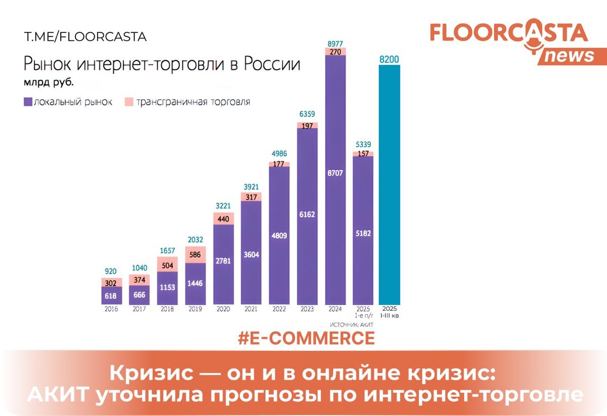 Кризис — он и в онлайне кризис: АКИТ уточнила прогнозы по интернет-торговле За первое полугодие 2025 года объем e-commerce в России вырос более чем на треть и превысил 5 трлн руб. Об этом напомнил премьер-министр Михаил Мишустин на пленарной сессии форума «Цифровые решения». В тот момент INFOLine Аналитика спрогнозировала, что в 2025 году рынок онлайн торговли в России вырастет до 14,5 трлн руб., увеличившись год к году на 28,3% Но время идет и прогнозы корректируются вместе с потребительским поведением и итогами нового квартала. ▪️Актуальные данные: по данным АКИТ, общий объем рынка e-commerce в России за 9 месяцев 2025 года достиг 8,2 трлн руб. Рост – 32% год к году. Сегодня онлайн-канал занимает в общем объеме розничных продаж страны 18,3%, что почти на 3п.п. больше, чем годом ранее. По данным Высшей школы экономики, онлайн-канал обеспечивает около 5% ВВП России. 🔹 Топ-10 регионов по объемам продаж остался неизменным. Его возглавила Москва — 16,7%, МО — 7,8%, Санкт-Петербург —