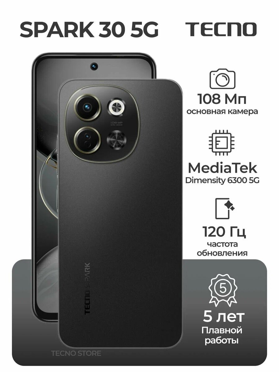 Привет, друзья! Сегодня расскажу про Tecno SPARK 30 5G — модель, которая при скромном ценнике умудряется предложить то, что ещё недавно считалось привилегией флагманов: поддержку 5G. Разберёмся, на что способен этот чёрный красавец и кому он подойдёт. Где купить: на Яндекс Маркет Да, покрытие 5G в России пока ограничено, но технология активно развивается. Покупая смартфон с поддержкой 5G сегодня, вы: Чёрный корпус SPARK 30 5G выглядит солидно — без кричащих акцентов, но с приятной фактурой. Смартфон: Размеры и вес подобраны так, чтобы устройство не казалось громоздким: держать его комфортно даже одной рукой. 6,78‑дюймовый IPS‑дисплей с разрешением Full HD+ и частотой обновления 120 Гц — это: Яркость достаточная для использования на улице, а защитные технологии снижают нагрузку на глаза при долгом чтении. Комбинация процессора MediaTek Dimensity 6300 и 6 ГБ оперативной памяти даёт: 128 ГБ встроенной памяти хватит для: Если нужно больше — есть слот для карты памяти. Основная камера на