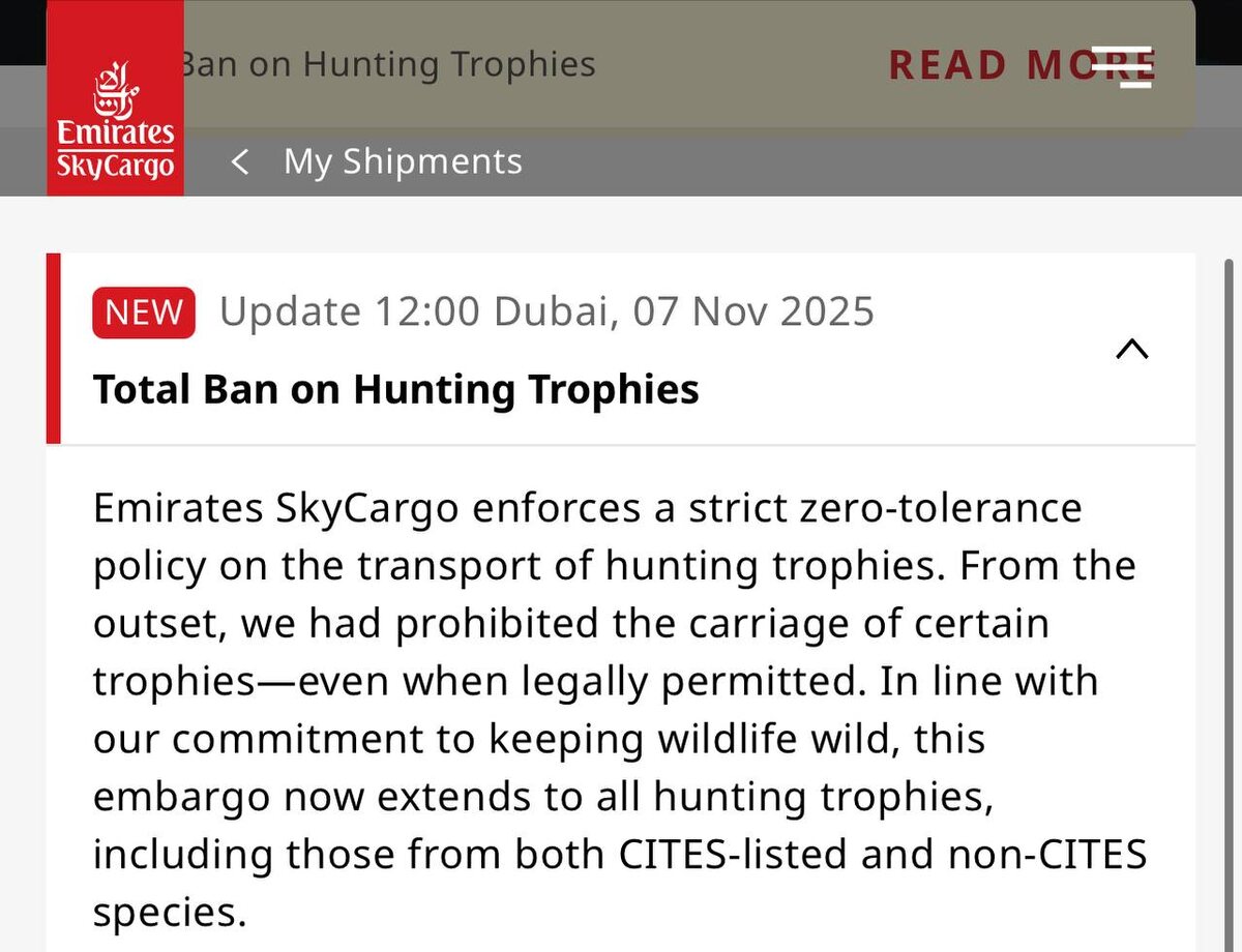 Не относится напрямую к теме нашего канала, но не могли пройти мимо этой новости: Sky Cargo Emirates запретили перевозку охотничьих трофеев. Вне зависимости от того, были ли они добыты с получением разрешения или нет, и входят ли в список CITES. #emirates #cargo #авиаперевозки ___________________________________ 🐶 Хвостатый Чемодан – тревел-агент вашего питомца