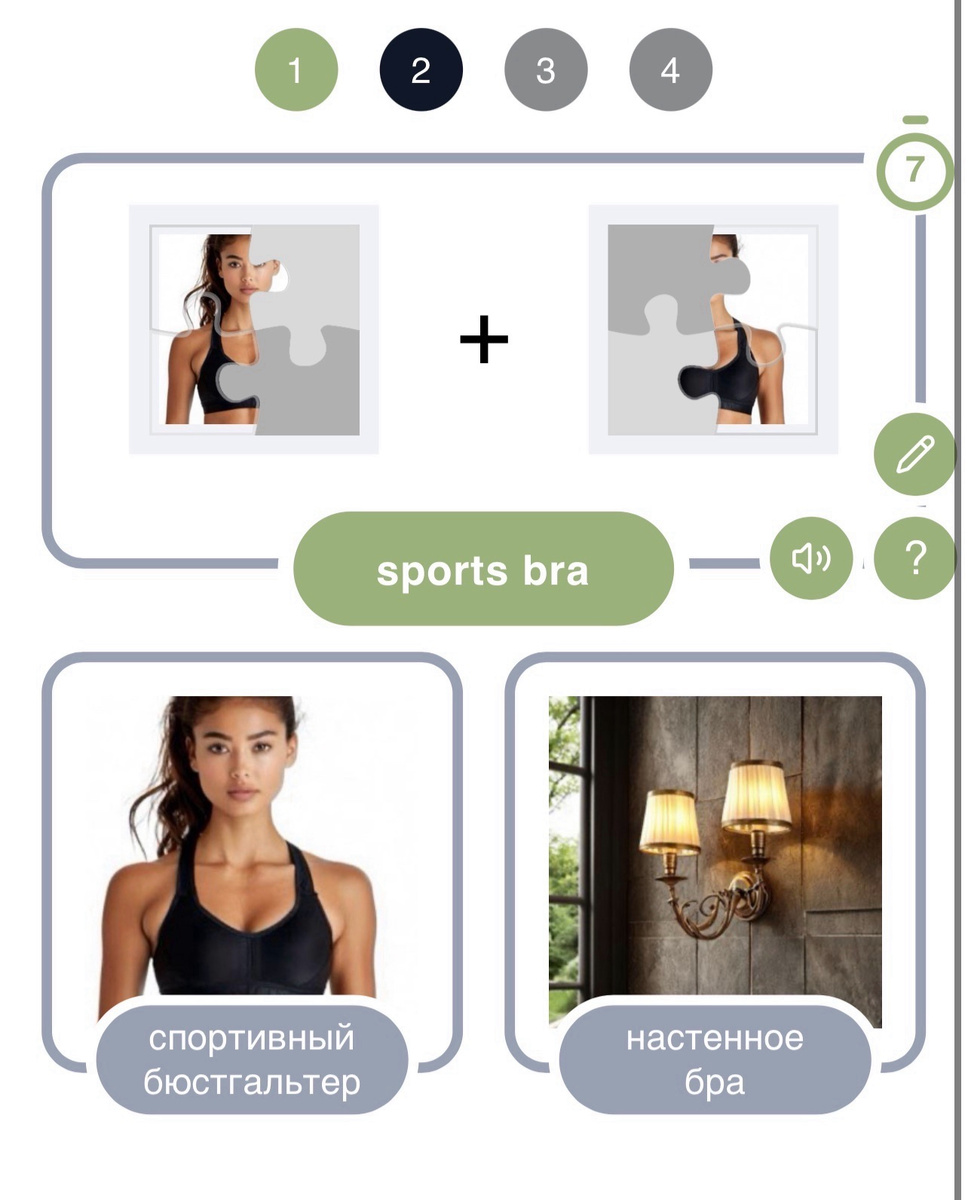 Решил написать статью про эти два слова из заголовка: русское «бра» и английское «bra» («бюстгальтер»). Сильно уж они похожи по звучанию, но совсем нет никаких признаков даже отдаленной родственности, как это часто бывает у других «ложных друзей переводчика», например, у слов, описанных в моей предыдущей статье: «brilliant» и «блестящий». Согласитесь, любой бриллиант всегда блестит! А вот какой урок со словами «бра» и «bra» получился у меня во фразовом онлайн тренажере Parrylingo, развитием которого я занимаюсь для того, чтобы самому более эффективно изучать английский и французский языки, а такое предлагать его возможности для всех желающих. Ниже размещаю скриншот страницы (в качестве примера) только одного этапа этого урока, в котором два слова попеременно, в сопровождении соответствующих изображений, фонограмм и переводов, представляются вниманию обучающихся. Оба слова взяты для этого урока в характерных для них словосочетаниях: «sports bra» («спортивный бюстгальтер») и «настенн
