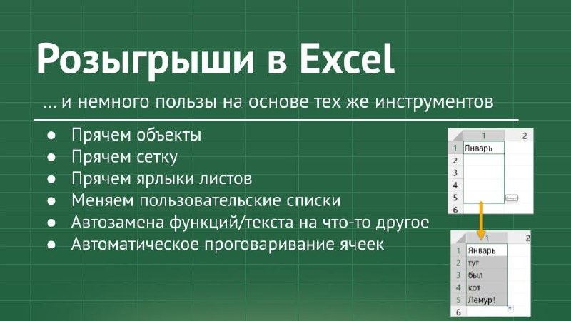 Если вы очень не любите Excel... и не любите тех, кто там работает... эта статья для вас! Парочка приемов оттуда в экселе ваших коллег — и вот уже в офис вызывают экзорциста, а все стремительно переходят на Google Таблицы😈 Розыгрыши в Excel: немного табличного хулиганства (и пользы тоже) При написании статьи ни один офисный сотрудник не пострадал, все тестировалось только на себе и коте Лемуре. --- 📗 Канал и Чат 📕 Оглавление канала 🏄 Заказ работы у нас