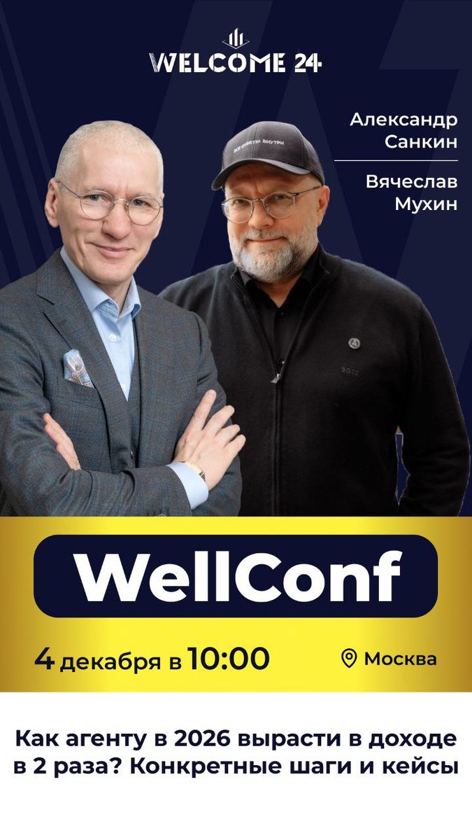 Уже 4 декабря встречаемся в Москве на WellConf — завершающем масштабном событии рынка недвижимости 2025 года. Вместе с Александром Санкиным расскажем, как агенту недвижимости в 2026 году увеличить доход в 2 раза. Поделимся конкретными шагами, кейсами и стратегиями, которые работают уже сегодня. WellConf — это не просто конференция. Это место притяжения сильных и амбициозных профессионалов, которые выбирают развитие, а не выживание. 📍 Москва, 4 декабря 🔗 Подробности и регистрация: w24.agency/wellconf