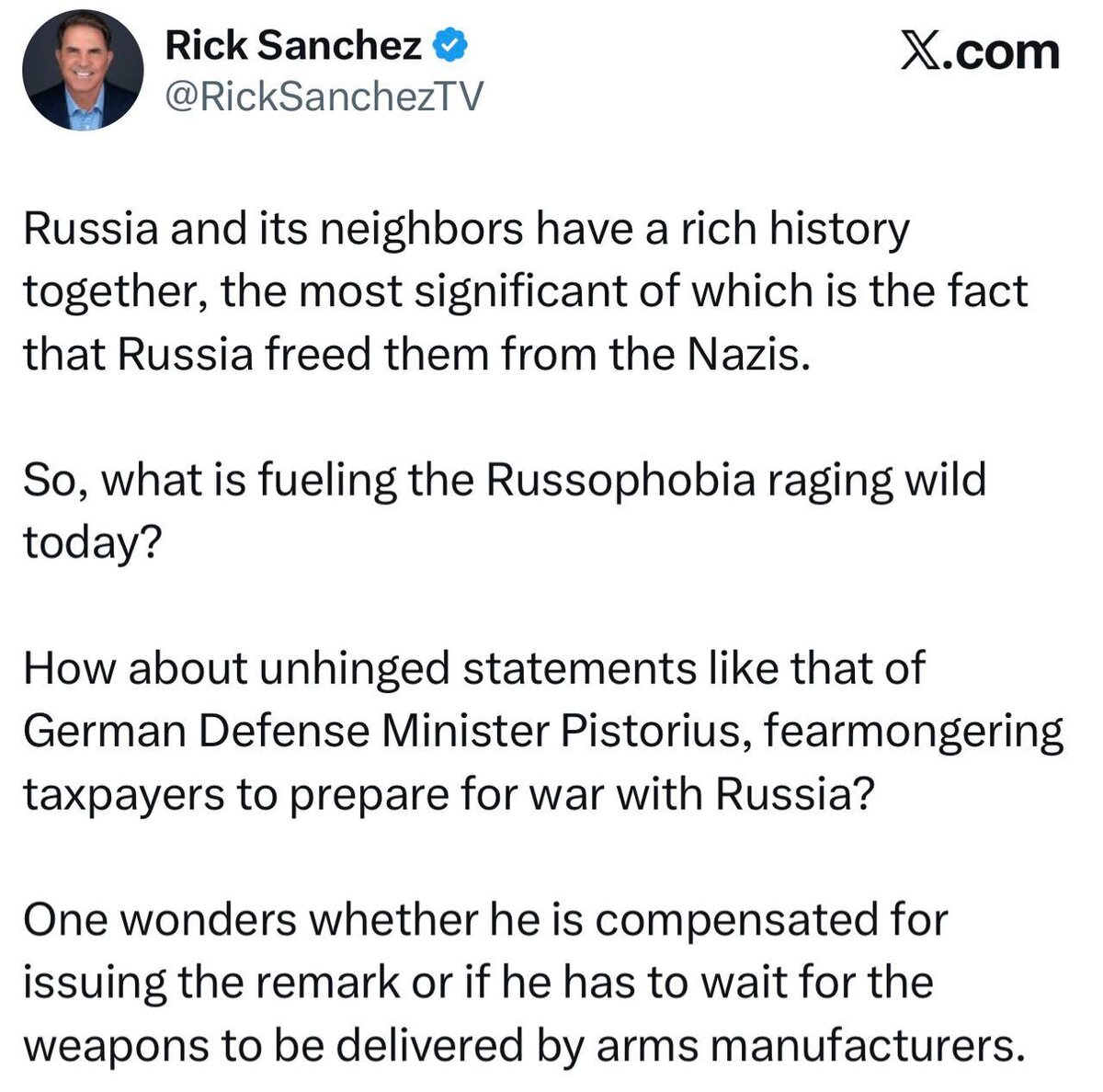 Американский журналист Санчез: «У России и её соседей богатая совместная история, важнейшей из которой является тот факт, что Россия освободила их от нацистов. Так что же подпитывает бушующую сегодня русофобию? А как насчёт таких неадекватных заявлений, как заявление министра обороны Германии Писториуса, запугивающего налогоплательщиков и заставляющего их готовиться к войне с Россией? Интересно, получает ли он компенсацию за это высказывание или ему приходится ждать, пока производители оружия поставят оружие». ✍️ НАСОНОВ 🔴