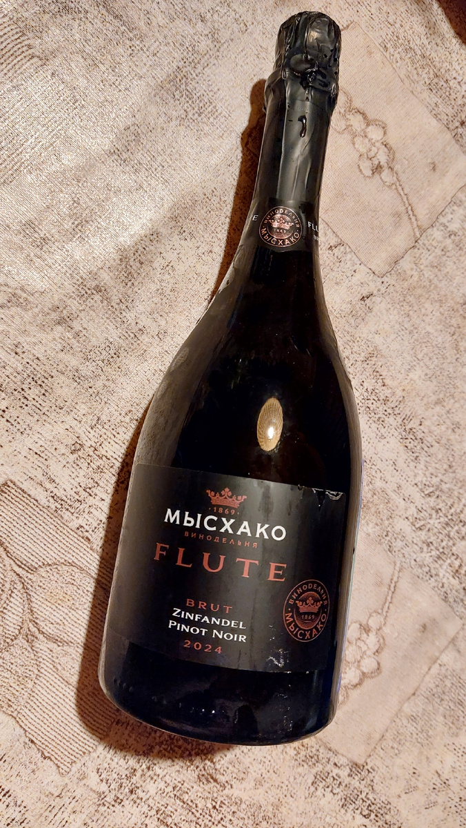 Постоянные читатели моего канала знают мое не совсем однозначное отношение к продукции Мысхако. Единственное вино, которое произвело по-настоящему хорошее впечатление, был тихий Шираз серии black out. Пару лет назад я пробовал игристый гевюрцтраитнер из серии flute, он также оставил хорошее впечатление, однако сейчас я бы оценил его пониже. Но тот факт, что Мысхако один из крупнейших производителей вина в нашей стране, оспаривать было бы странно. Тем более, что основная часть вин этого производителя попадает в масмаркет и стоит до 1000 р., а значит это весьма народный производитель, вино которого люди, наверное, покупают нередко. Тем не менее я для себя решил, что покупать продукцию Мысхако не буду, за исключением каких-то очень интересных по цене или содержанию вариантов. И вот такой момент настал. По неплохой цене мне попалось игристое Flute zinfandel pino noir brut 2024. Бутылка вина добротная, шаманской формы, из темного стекла. Оформление - в общей идеологии линейки Flute, котор