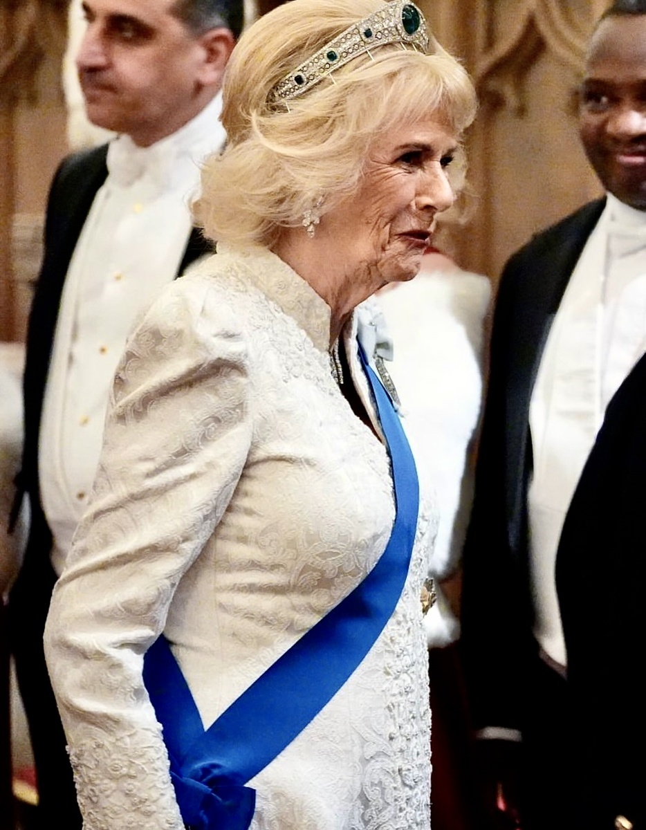 А вот и тиара с намеками, о чем мне подумалось. Мы видим на королеве кокошник с изумрудами Гревилль. На предыдущем банкете она также надела ожерелье из наследия Гревилль.