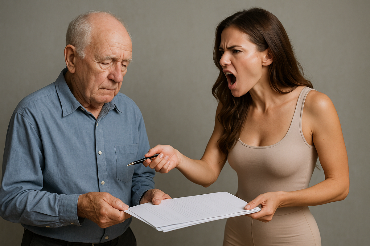 Она привела отца к нотариусу — всё под предлогом «оформить доверенность на лечение». Старик плохо видел, руки дрожали, но рядом сидела дочь, улыбалась и шептала: