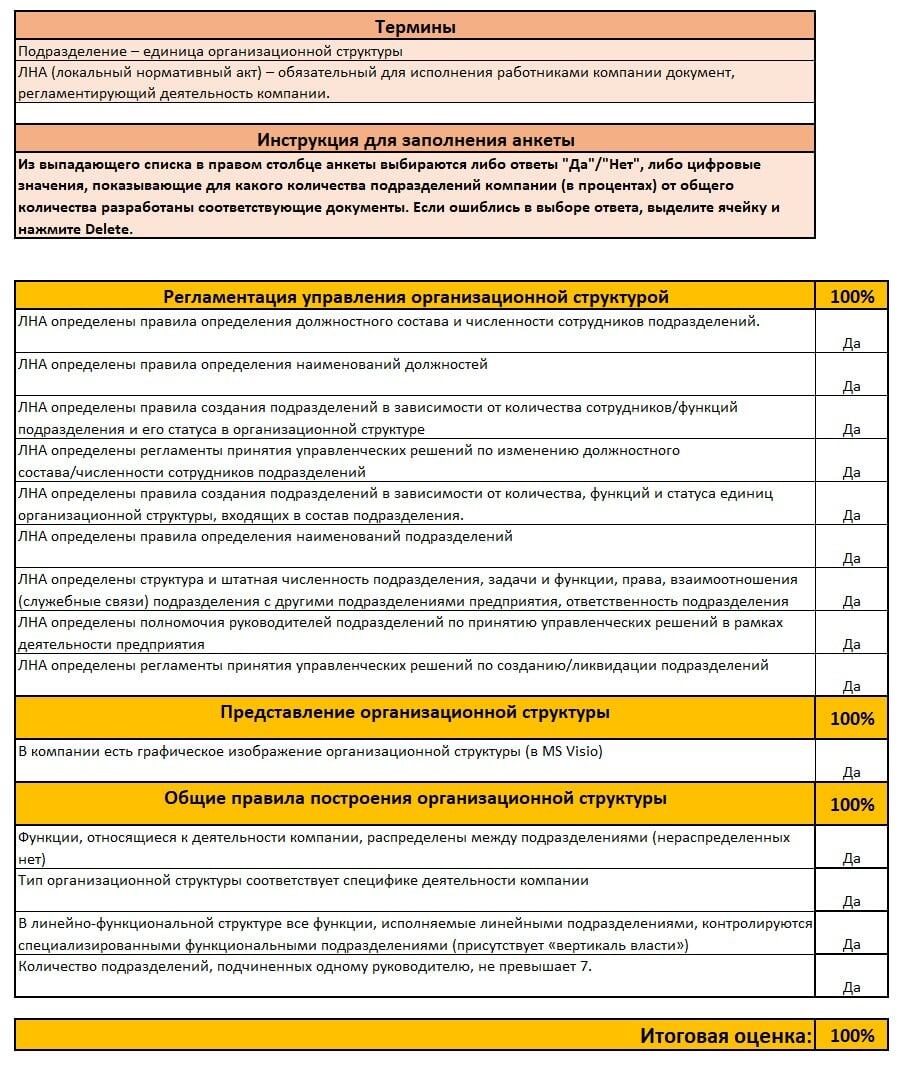Ранее о применении этих терминов на практике написана статья Что такое организационное развитие, как научиться управлять организационной структурой. В ней же упоминалась Анкета для оценки системы управления организационной структурой, речь о которой пойдет в этом материале. Сложных алгоритмов в анкете нет - она всего лишь позволяет оценить "серьезность" подхода компании к организационному развитию и управлению организационной структурой. В анкете три раздела, оценки в каждом из которых определяют итоговый результат. Оценивается наличие/отсутствие в компании документов, определяющих порядок формирования и изменения организационной структуры, наличие графического представления организационной структуры, соблюдение общих правил построения организационной структуры.