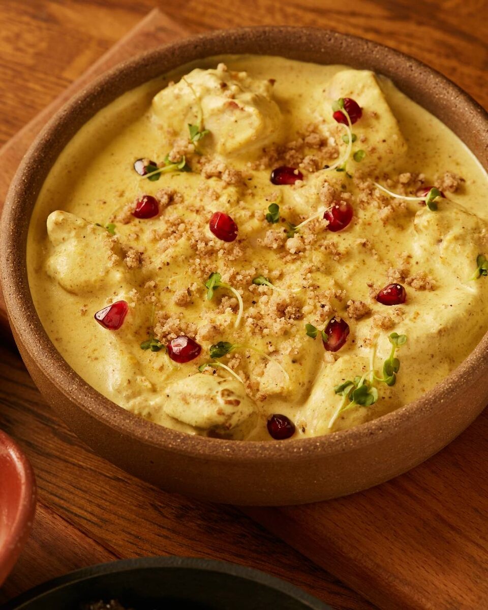 - Подавать прямо в сковороде, обязательно с горячим шотис пури или мчади. И не забудьте ложку — соус важнее курицы.