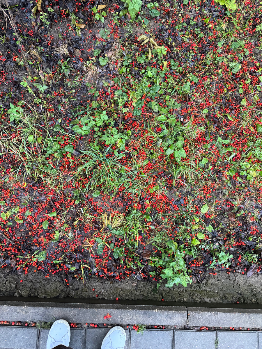 Мне так это понравилось! Хочу и вам показать! Идёт дождь, все вокруг готовится к зиме, серое, а тут такое яркое пятно… Как-то даже радостно стало. Рябина.